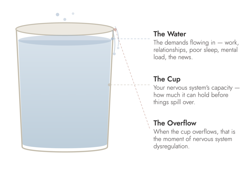 Imagine you’re carrying a cup. The cup is your nervous system’s capacity – how much it can hold before things spill over. The water is everything flowing in – the demands on your nervous system. Work, relationships, poor sleep, mental load, the news. Drip, drip, drip.