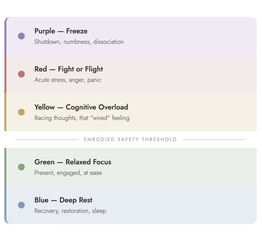 Passaler writes: “The key to a healthy nervous system lies in its flexibility, not balance.” Visiting Red or Yellow isn’t the problem. Getting stuck there is.